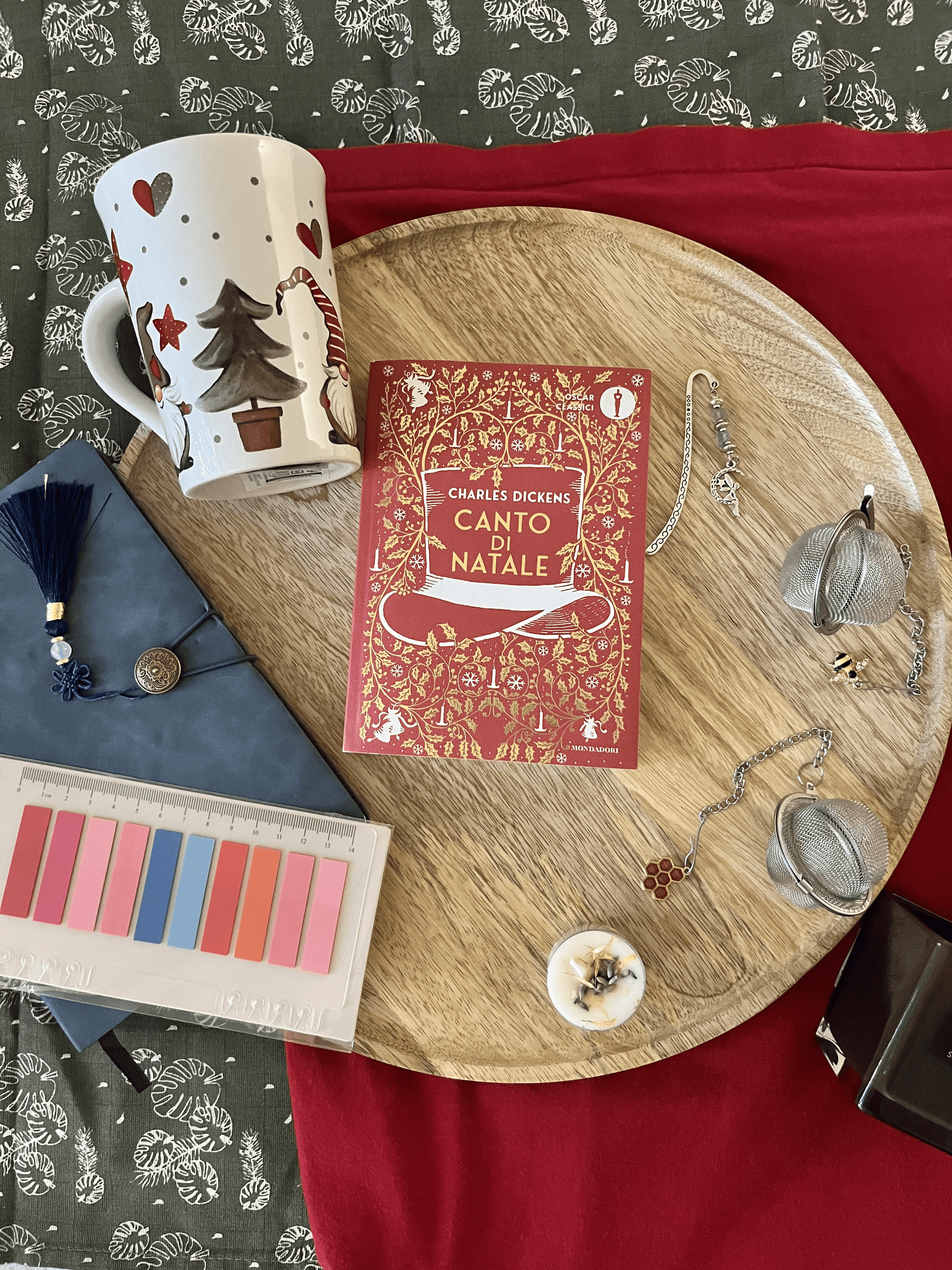 Ad accompagnare la lettura, una serie di dettagli pensati per rendere speciale ogni pagina: un segnalibro artigianale, segnapagina colorati, una candela profumata, un taccuino per annotare pensieri e riflessioni, una tazza natalizia per le tue bevande calde e un infusore per il tè*.